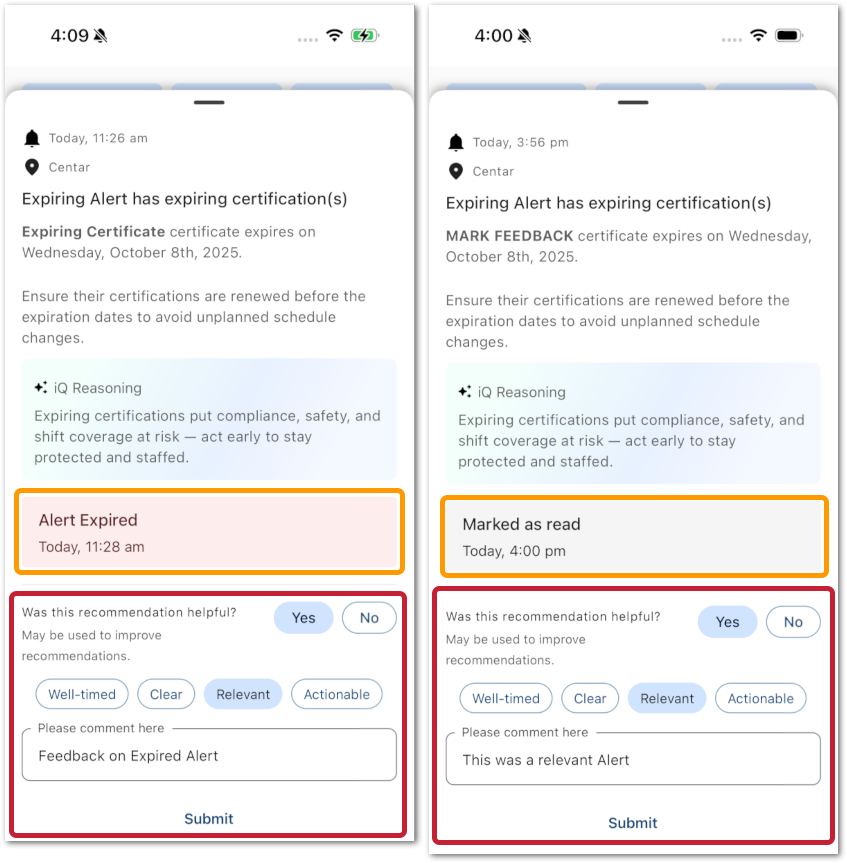 🎯 Feature 1: User Feedback on Closed Actions & Read Alerts