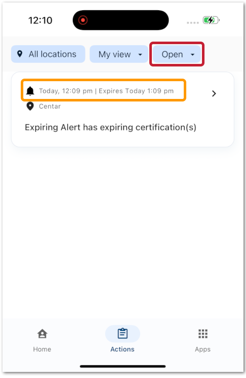 - Alerts with expiry dates show remaining time: "Expires in 3 days" or "Expires Today at 14:30"