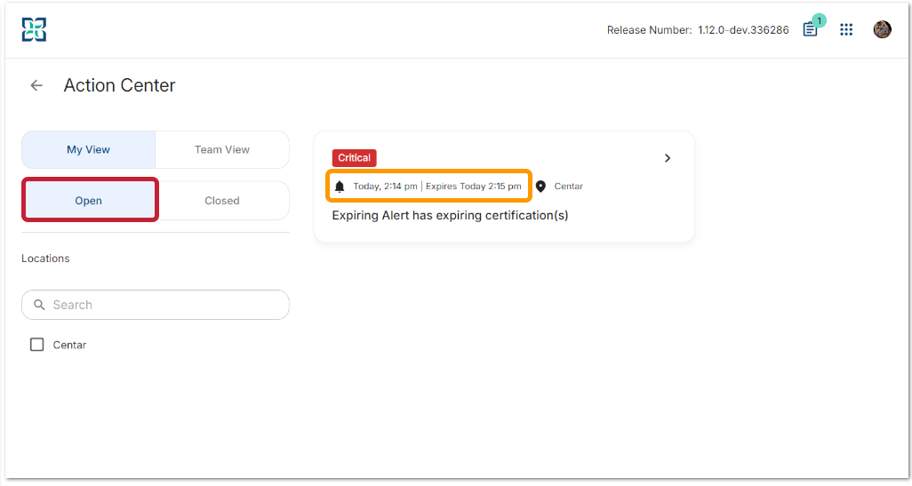 - Open tab: Shows active actions and alerts with feedback capabilities (with expiry countdowns where applicable)