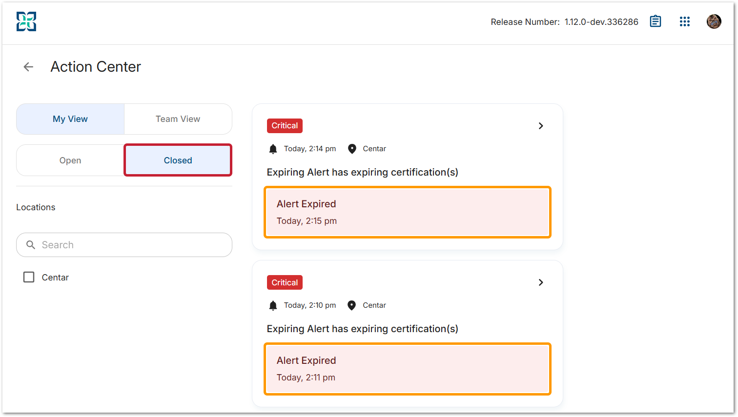 - Closed Alert indicators: When viewing a closed/expired alert, the closure information moves to a block at the bottom of the card