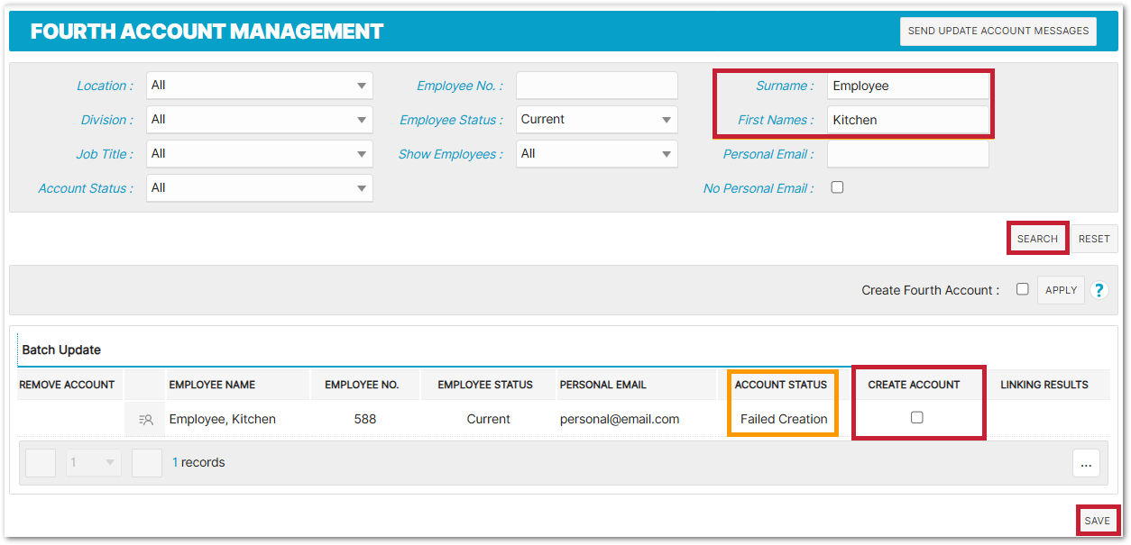 - If the account has failed to create (see 'Failed Creation' status in Fig.1), and this has not yet been tried, tick the Create Account box and then Save