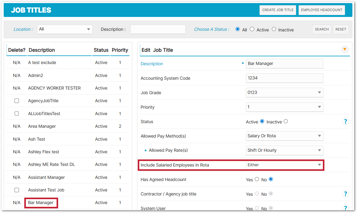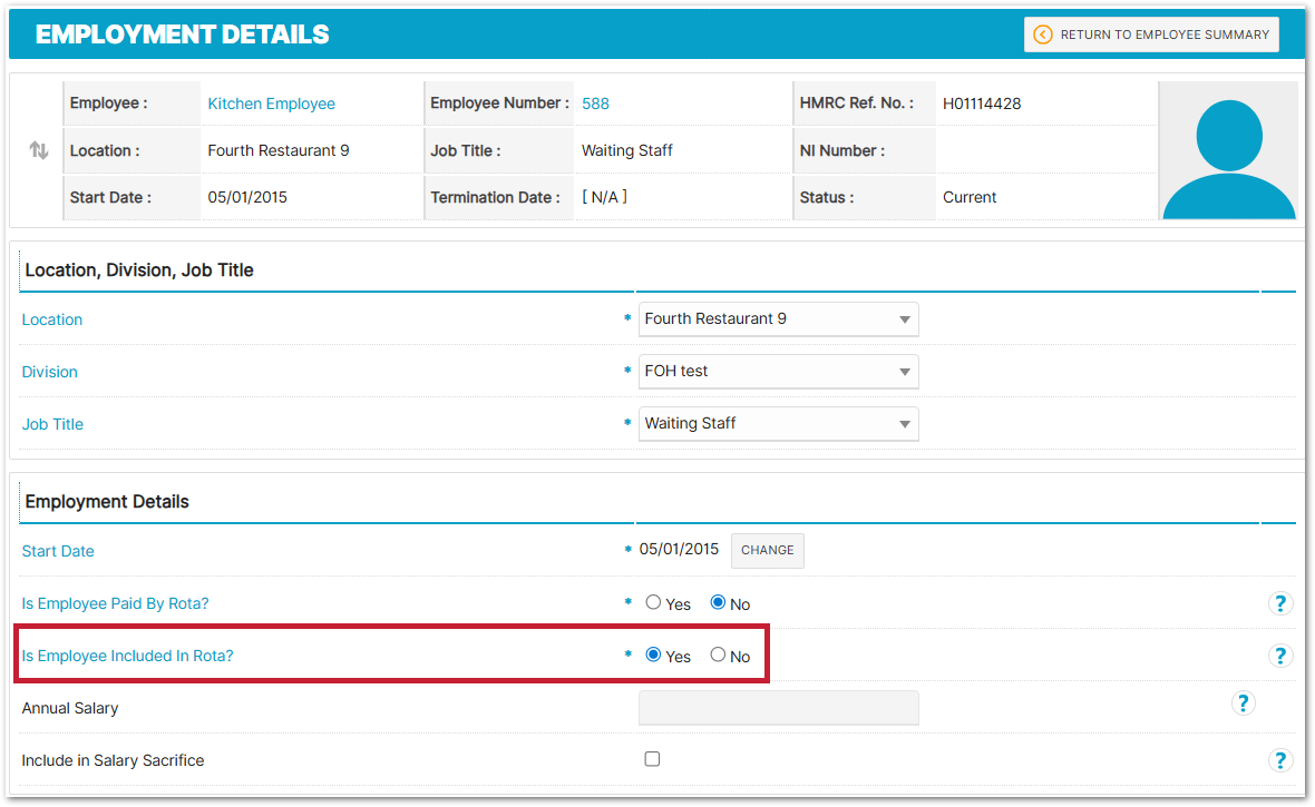 Sometimes, if changes have been made to an employee's job title, FTE details, "Include Salaried Employees In Rota" option to yes, etc, then these details need to be repushed through on the Employment Details screen.