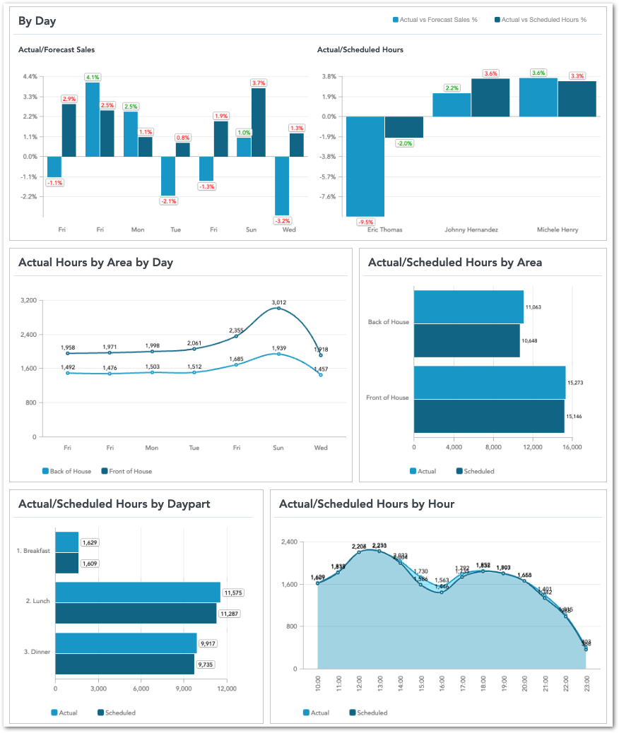 Actual Sales – Actual Sales are exported to analytics by location, hour, and revenue type (i.e., Drink, Food, Other)