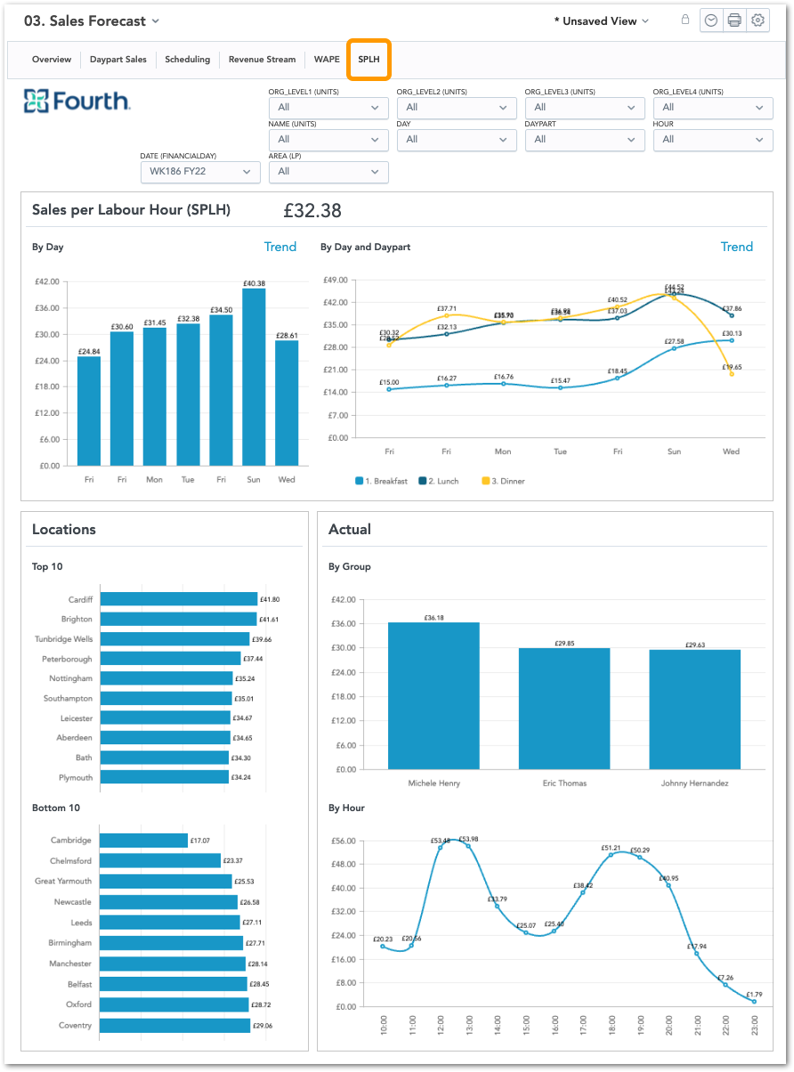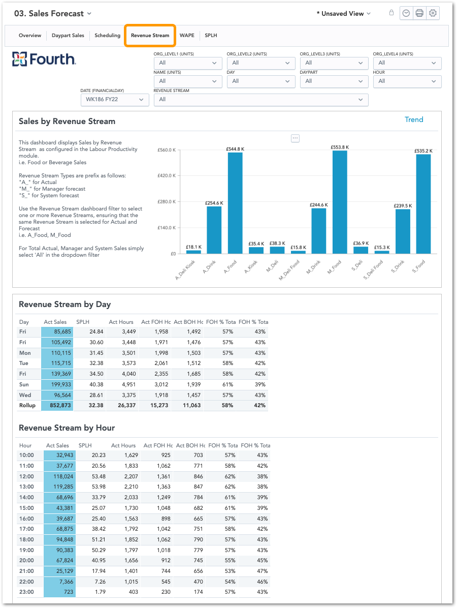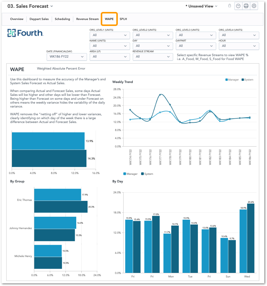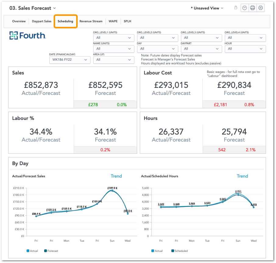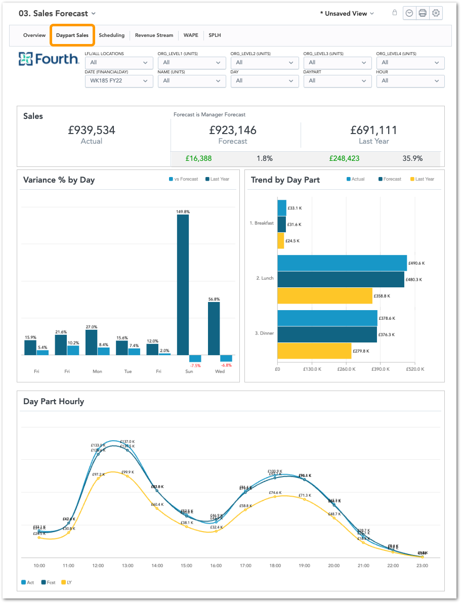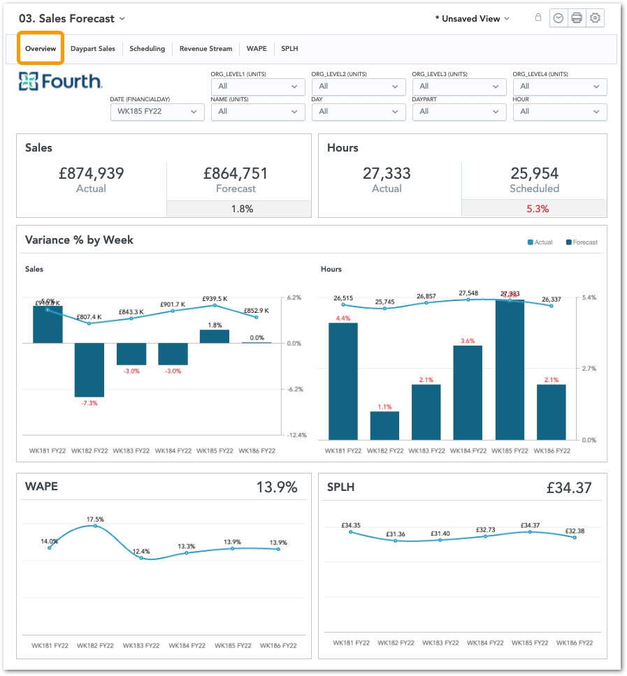 The Sales Forecast dashboard displays data from Fourth's WFM Scheduling module and is available to Enterprise IQ customers.