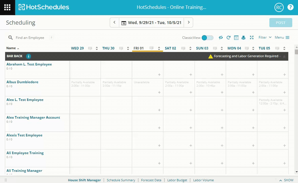 Al programar tus horarios, es posible que veas un mensaje indicando, Previsión y Generación de Turnos Laborales Requerida (Would need specific vocab from HS). Esto indica que su empresa utiliza la función Pronósticos Basadas en Actividad, que en algunos casos requiere que se genere una pronóstico y/o turnos labores antes de que se pueda iniciar ediciones en el horario.