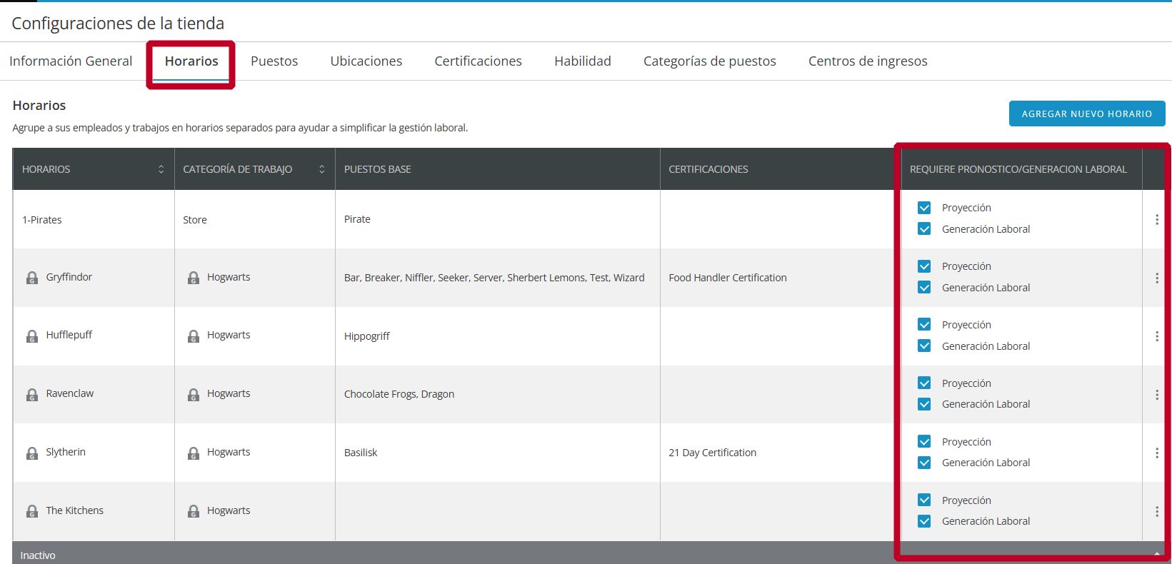 Se puede revisar qué horarios tienen esta configuración habilitada en la página de Configuración de la Tienda. Consulte Configuración de la tienda HS: Horarios (agregar, editar e inactivar) para obtener más información sobre esa sección.