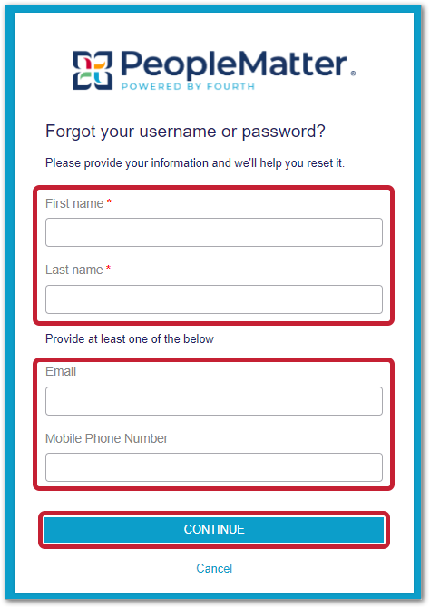 - Enter your personal identifiers, including First name, Last name and Email or Mobile Phone Number and then select Continue