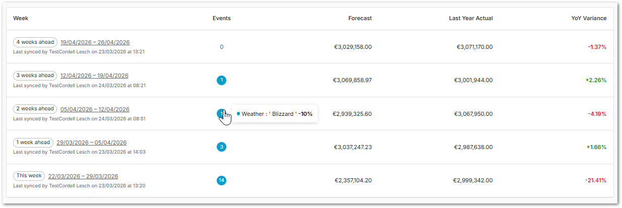 The page shows key trends and comparisons to previous weeks and the last year (see Fig.2), making it easy to see how current forecasts align with historical actuals. A combined graph and data table provide flexible ways to explore the information, while event‑level tooltips (see Fig.3) highlight the impact of specific factors. This streamlined view delivers fast, actionable insights to support proactive planning.