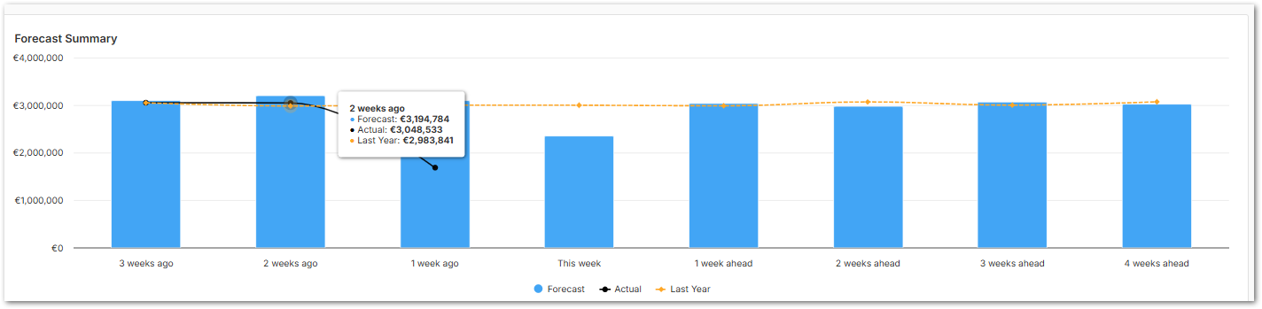 Forecast Manager now includes a new ‘Forecast Summary’ page that gives managers a clear, consolidated weekly view of forecast performance. Weeks can be scanned quickly, with the option to drill into any period for deeper insight, removing the need to switch between multiple reports.