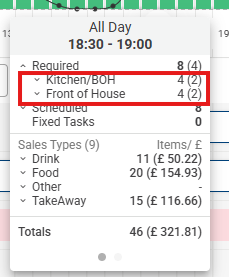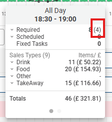 Minimum staffing levels are displayed within the tooltip as part of the required staffing section, shown in brackets alongside the standard required figures. This provides immediate visibility into the baseline staffing floor directly from the tooltip, without needing to navigate elsewhere.