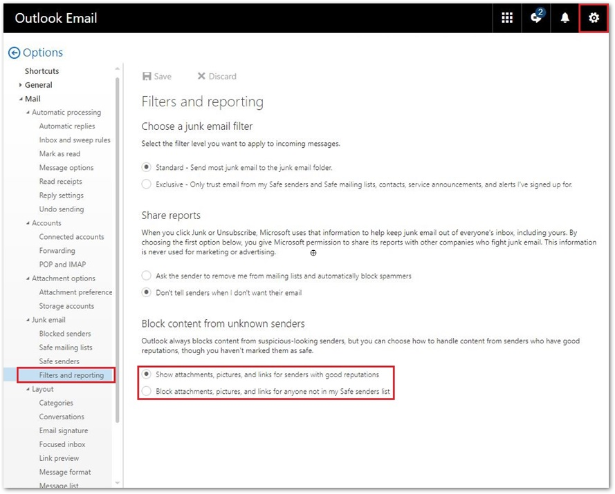 Fig.1 - Outlook/Hotmail Filters and Reporting settings