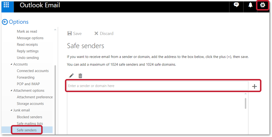 - Go to Junk email > Safe senders on the left side menu