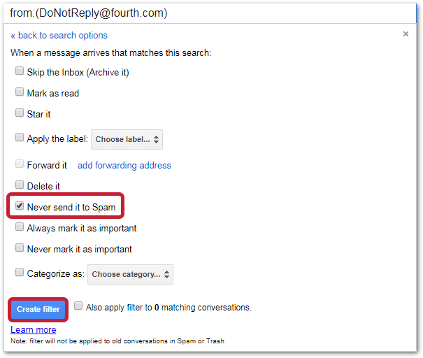 - Tick the box next to Never send it to Spam