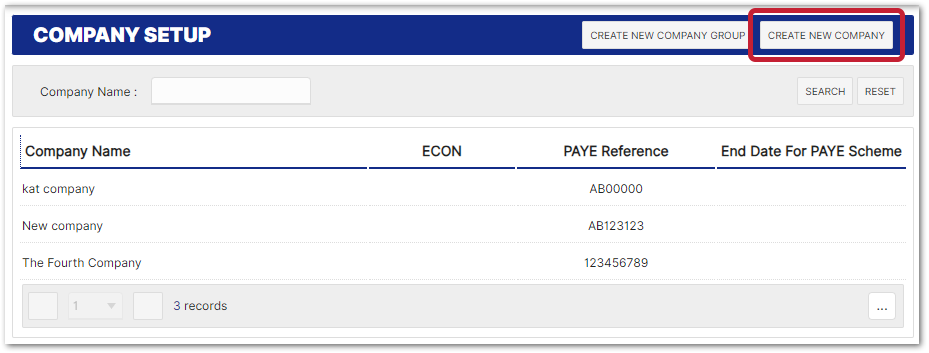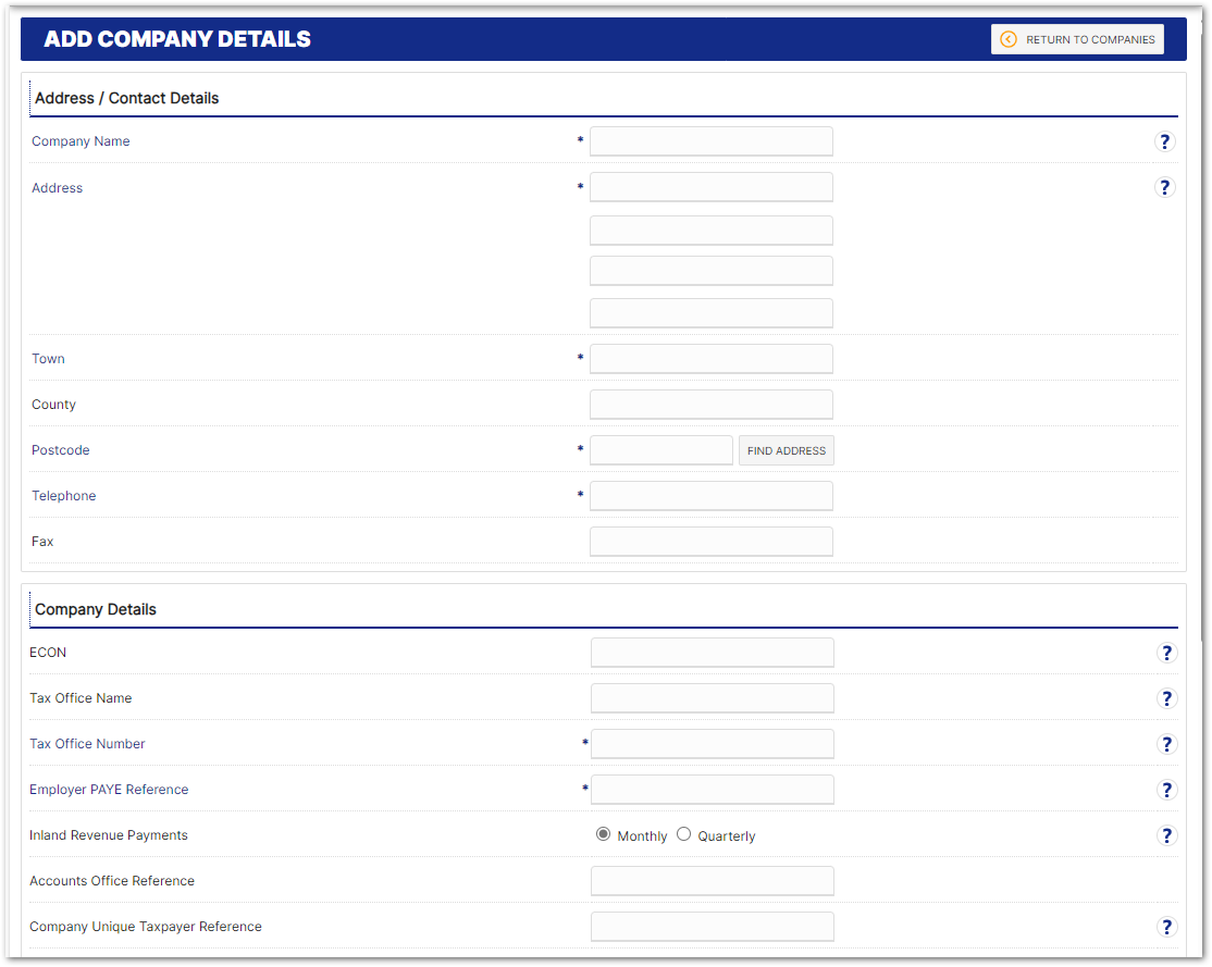 This article describes the process of creating a new Company in the Payroll module, including bank details and pay basis setup. Please ensure that you have all of the required details (things like Tax Office Number, Employer PAYE Reference, etc) before starting.