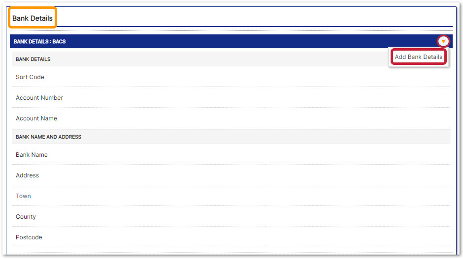 - Scroll down to the 'BankDetails' section and select Add Bank Details from the drop-down arrow