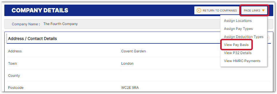- On the new 'Company Details' use the Page Links drop-down (top right) and select View Pay Basis