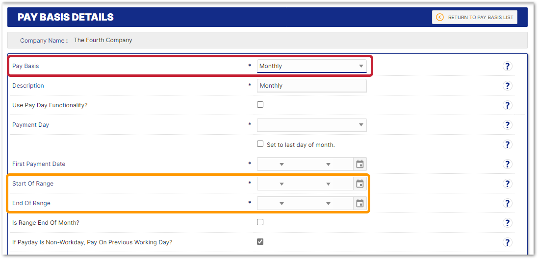 - Select the required Pay Basis from the drop-down menu and populate the other fields as required