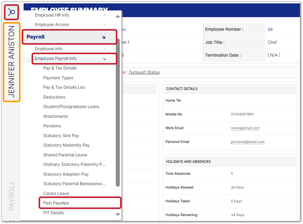 - Use the employee side panel and go to Payroll > Employee Payroll Info > Past Payslips