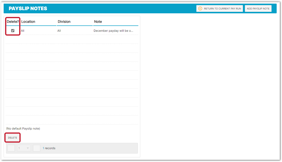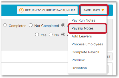 - From the Pay Run Details page, use the Page Links drop-down and select Payslip Notes