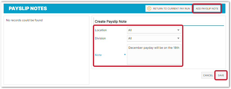 - If required, enter the Location and Division (leave as All if the message is to be displayed on all payslips)