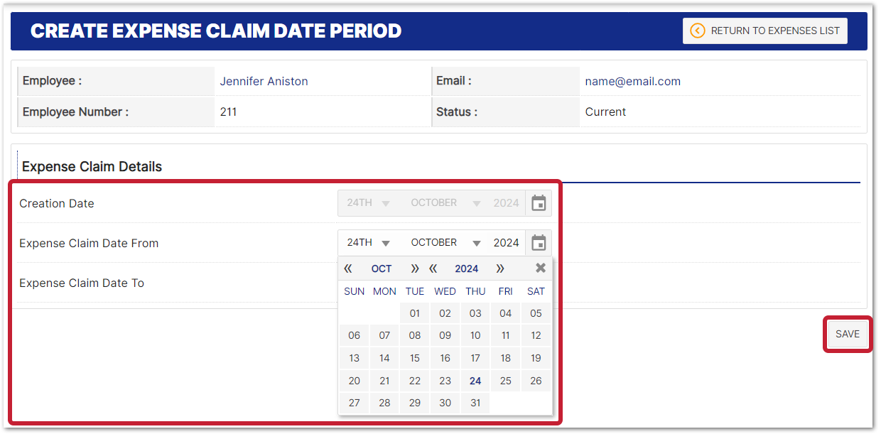 - Enter the dates for the period in which the expenses fall in, e.g. if expenses are paid on a monthly basis, enter the date that the period starts and ends