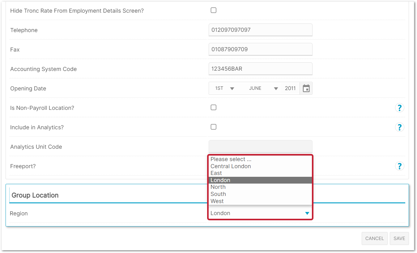 In the Edit Location page, select the appropriate type from the Group Location drop-down menu. For example, in a Region, a location in Brighton would be ‘South’