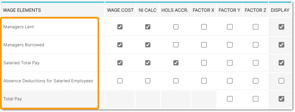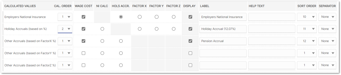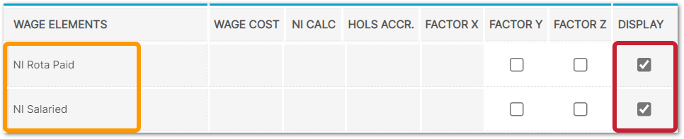 - The Wage Cost column must be ticked if NI, holiday accrual or other accruals are to be calculated by the system
