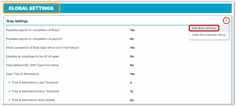 - Use the yellow arrow drop-down and select Edit Rota Settings