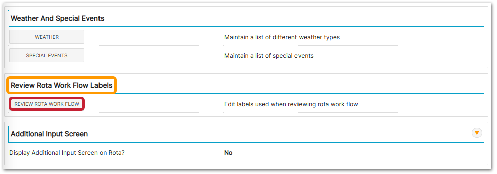 - Scroll down to the 'Review Rota Work Flow Labels' section and select Review Rota Work Flow