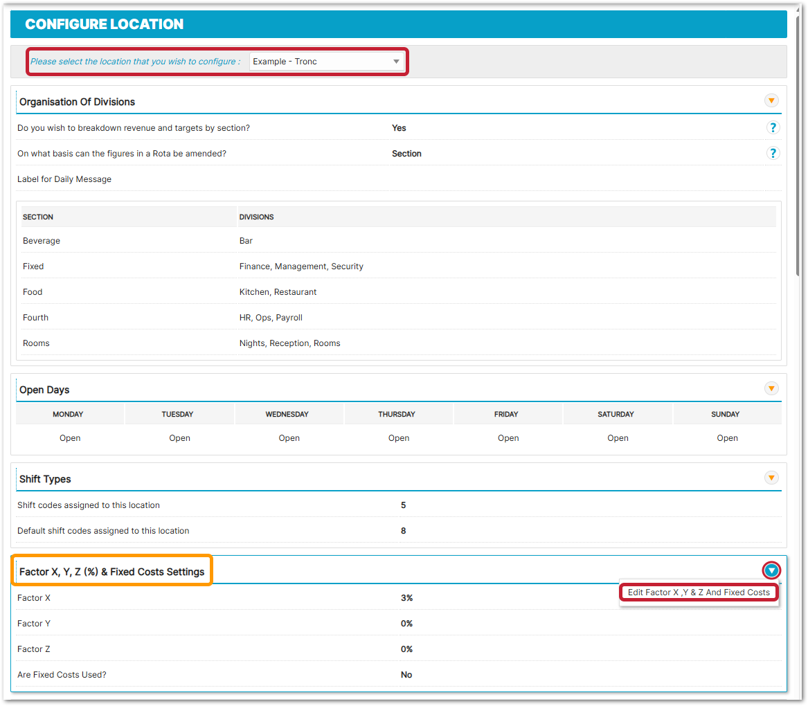 This article explains how to configure 'Factors' X, Y, and Z. This function allows additional costs to be added to the rota wage cost to close the gap with payroll, typically used to account for pension, bonus, and accural costs. This will display in rota analysis and monthly wage cost analysis reporting and the percentage can be manually updated via Configure Locations.