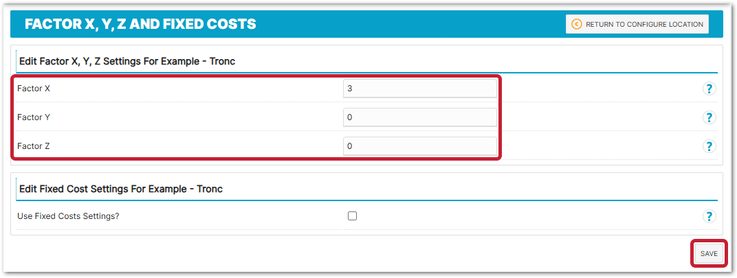 - Select a Location from the drop-down and scroll down to the 'Factor X, Y, Z (%) & Fixed Costs Settings' section