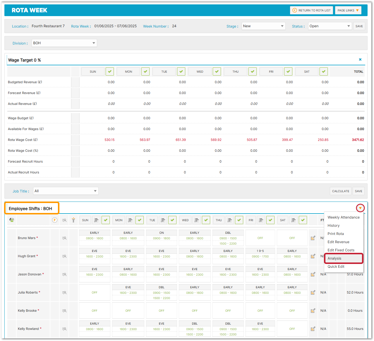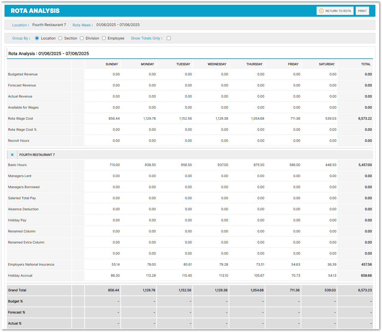 The Rota Analysis can be accessed whilst in any rota and can be broken down to either a Location, Divison, Section or Employee level.