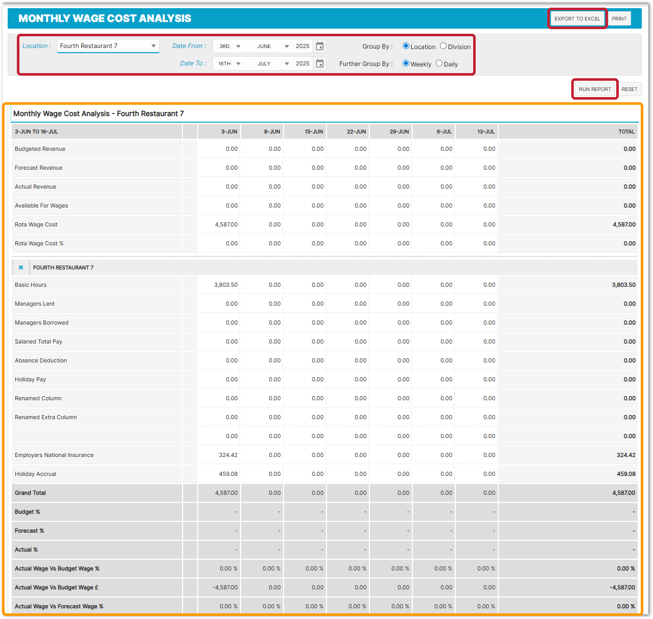 The Monthly Wage Cost Analysis Report can be run per location for a selected date range, grouped to a location or divisional level and a further 'group by' option is available to show the data in a weekly or daily sum. This report can also be exported to Excel for further manipulation if required.