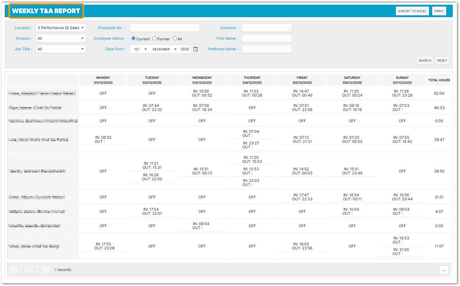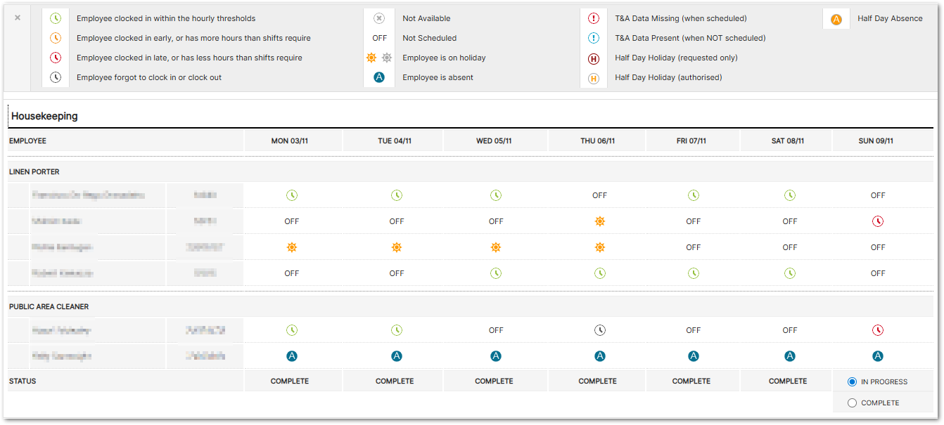 - Attendance records are also viewable on the Day Content screen by selecting the day of the week from the open rota