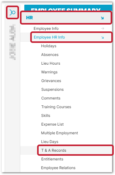 - Having selected an employee from the Employee List, use the employee side menu and go to Employee HR Info > T&A Records