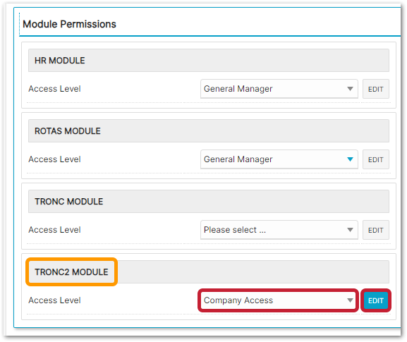 - Under the Tronc2 Module section, select Edit next to the required Template