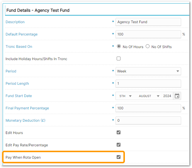 Fig.9 – The Fund Administration setting to allow Rota to be Open when processing Tronc
