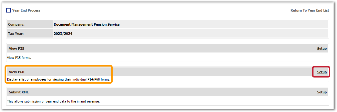 - Select the previous Tax Year > select the Company > select Setup