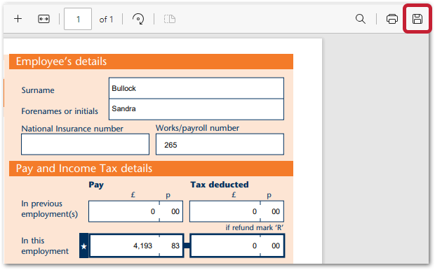 - To download the PDF version of the P60 (to email to the employee), select Save, using the option in your web browser