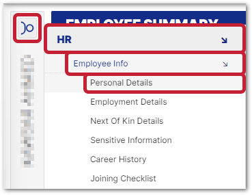 - Use the employee side menu and go to HR > Employee Info > Personal Details