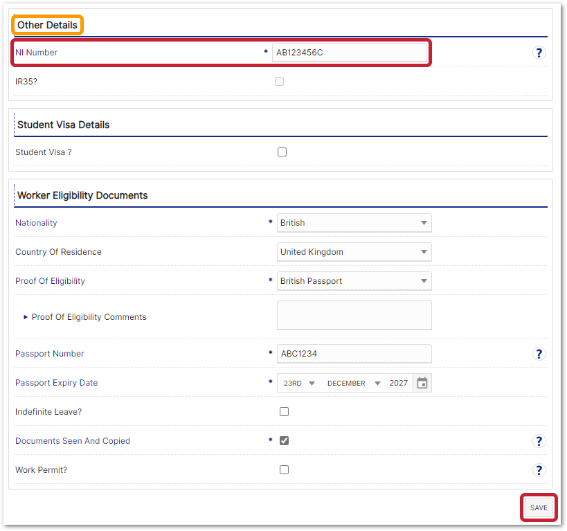 - Scroll down to the 'Other Details' section, update the NI Number field and then Save