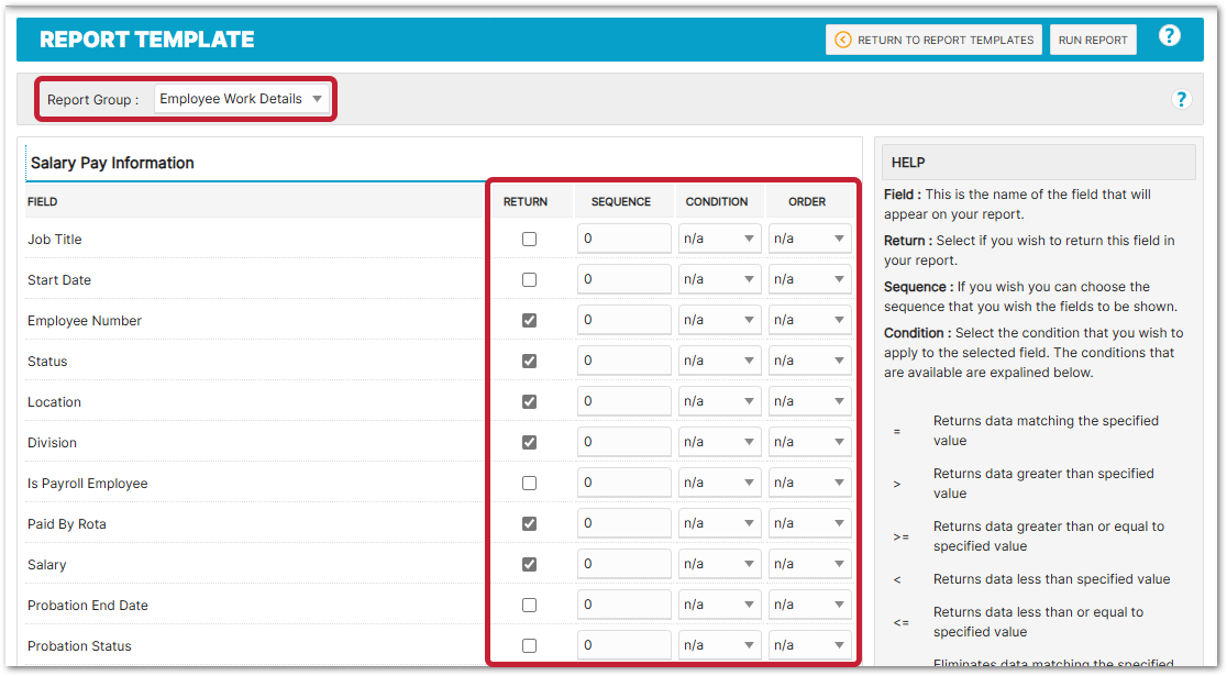 - Select any required Conditions – for example, to show current employees only, select '=' against the Status field