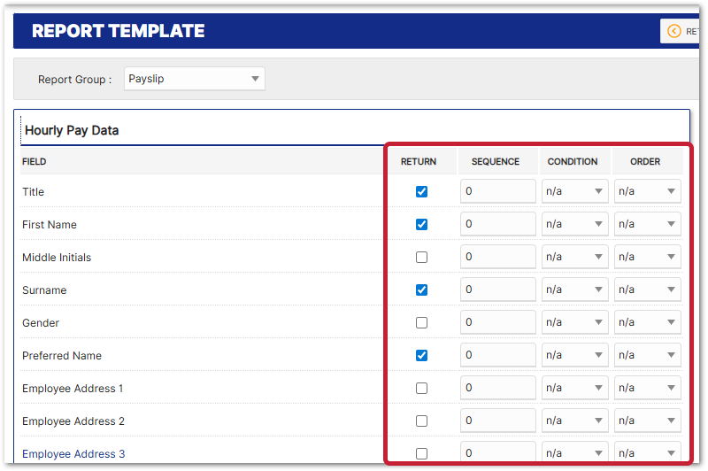 - Use the Return tickboxes to select the data fields to be returned in the export