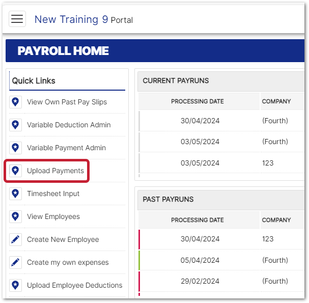 - From the Payroll module homepage, select Upload Payments from the 'Quick Links' menu on the left