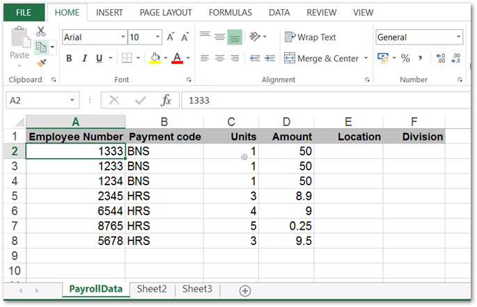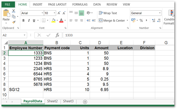 Like 'Employee Number', all cells under the 'Payment code' heading need to be in the same format and not a mixture of numeric and alphanumeric