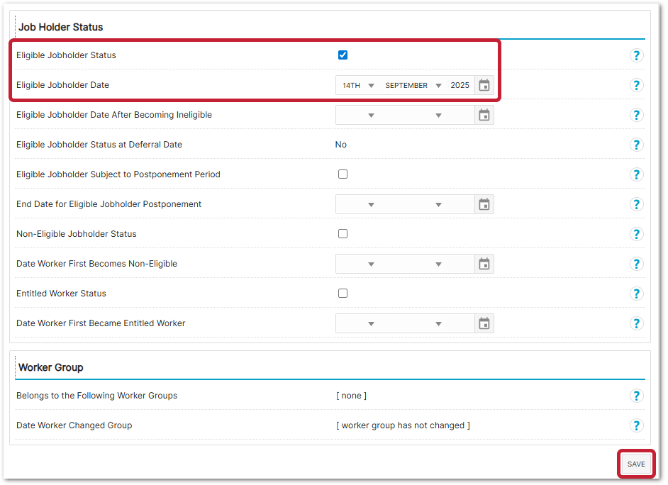 - Tick the Eligible Jobholder Status box and add the start date of the Pension Reference period in the Eligible Jobholder Date field