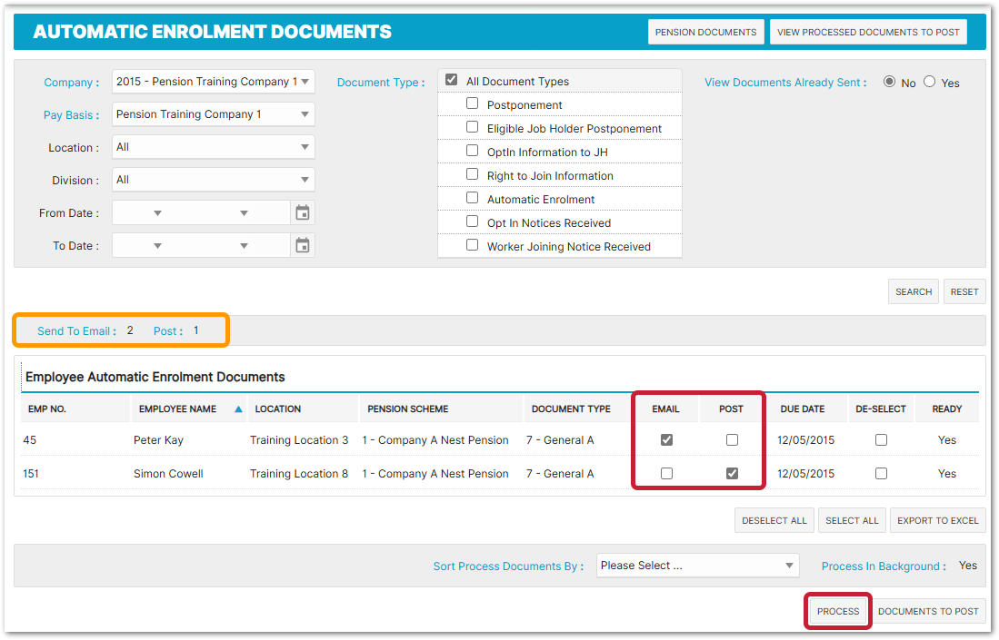 - Select a letter by ticking the Email or Post field as required and then select Process