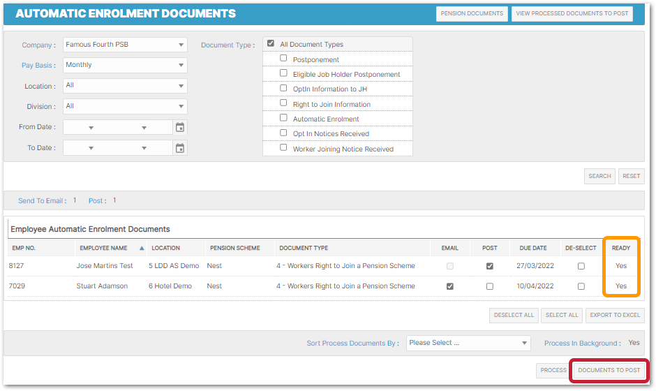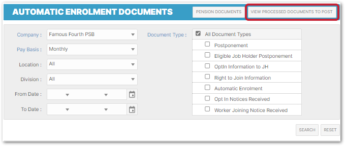 - On the next screen, 'Automatic Enrolment Documents', select the Company and Pay Basis