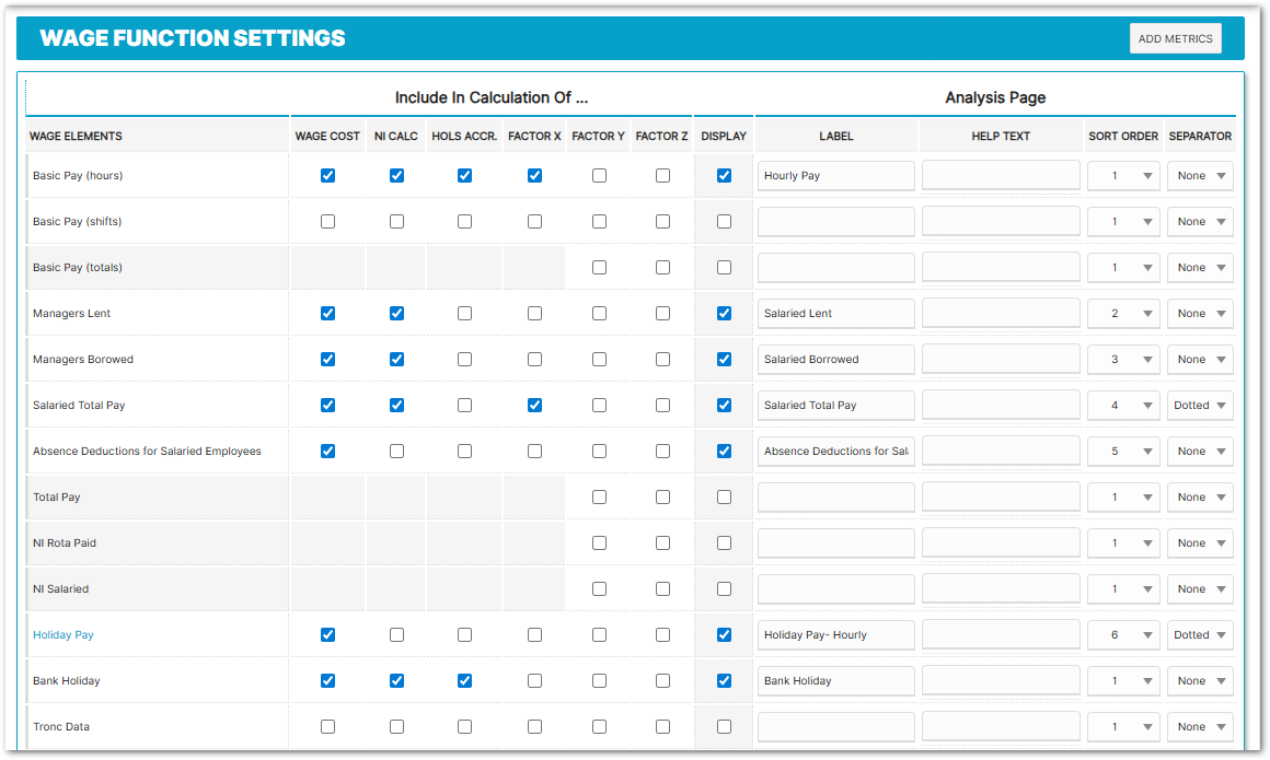 What is included in a customer’s Rota Wage Cost is determined within the Wage Function setting. A business can choose which pay elements are included and which are displayed. The wage cost elements can also be renamed as appropriate. It is important to ensure as many costs as possible are included, including tronc, holiday and any accruals, to narrow the gap between the rota and payroll reports. Other elements to consider including are fixed costs, pension costs, and statutory sick pay.