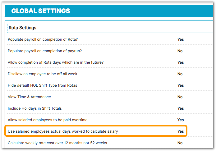 - Check the Global Setting to either show the salaried cost split over 7 days or attributed to the scheduled days. If the latter, the salaried employees must be scheduled